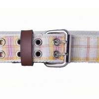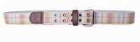 Natural webbing belt with pink and yellow plaid ribbon, grommet belt holes, leather detail, and polished nickel prong buckle. 1 1/2" wide.