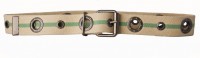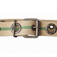 Yellow cotton webbing with green stripe and antique brass grommets and prong buckle. 1 1/2" wide.
