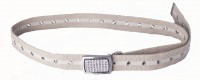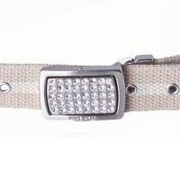 Tan and natural cotton webbing belt with matte nickel grommets and rhinestone buckle. 1" wide.