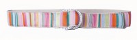Natural cotton webbing with pink and multi-colored striped ribbon and polished nickel rhinestone o-ring closure. 1 5/8" wide.