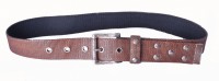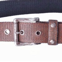 Tobacco waxed cotton webbing belt with nailhead studs and grommets, with antique nickel and rust prong buckle. 1 1/2" wide.