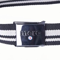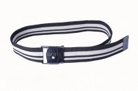 Black and natural stripe polyester webbing belt with gunmetal flip top buckle. 1 1/2" wide.