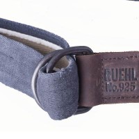 Navy cotton webbing belt with camel and natural stripe, leather patch and blackened copper d-ring closure. 1 3/4" wide.