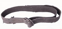 Washed brown cotton webbing with rivets and antique copper d ring closure. 1 3/4" wide.