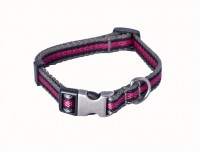 Grey, black, and raspberry herringbone nylon webbing dog collar with black plastic and antique nickel hardware. 3/16" wide.