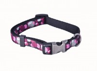 Black organic cotton webbing dog collar with printed ribbon and black plastic and antique nickel hardware. 3/16" wide.