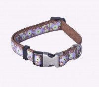 Brown organic cotton webbing dog collar with printed ribbon and black plastic and antique nickel hardware. 3/16" wide.