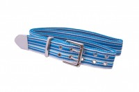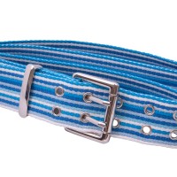 Blue and white striped webbing belt with grommets and metal hardware.