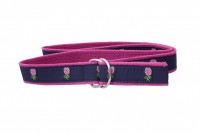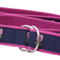 Fuchsia webbing belt with pineapple pattern ribbon and d-ring closure.