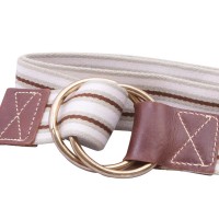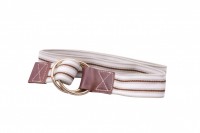 Natural and brown striped webbing belt with brown leather tab and metal o-ring closure.