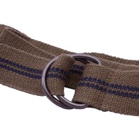 Olive webbing d ring belt with blue stripes and metal hardware.