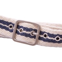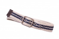 Natural webbing belt with blue stripes and metal grommets and prong buckle.