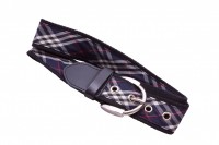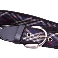 Black webbing belt with plaid ribbon and metal prong buckle and grommets.