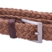 Tan braided belt with brown leather details and prong buckle.