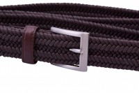 Brown braided belt with brown leather details and metal prong buckle.